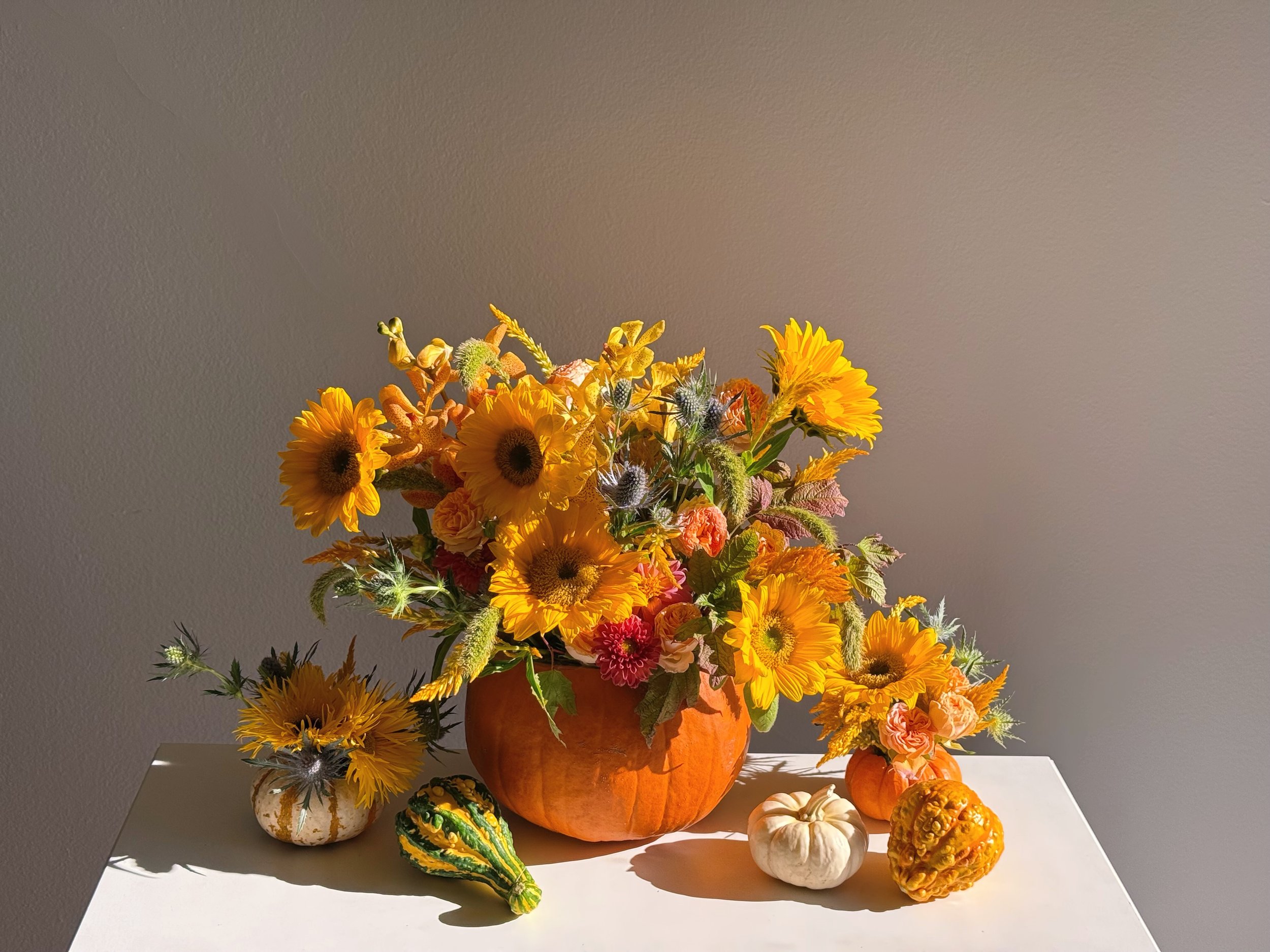 Pumpkin Glow celebrates the warmth and abundance of the season, a radiant mix of sunflowers, dahlias, and autumn textures arranged in a real pumpkin vase.