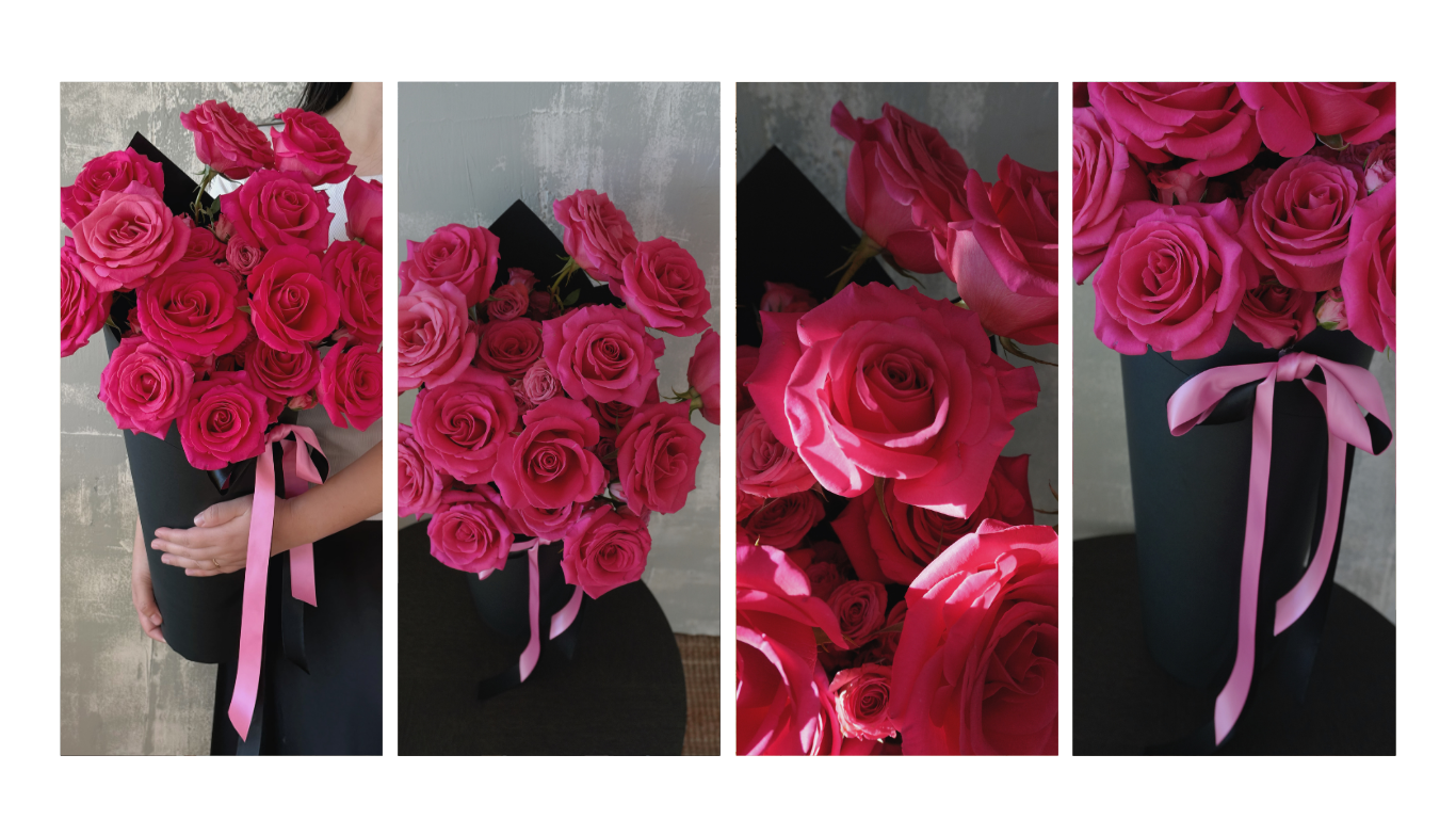 Our pink rose designs are intentionally rich and full, available in both traditional bouquets and our signature ice-cream-style containers. They’re playful yet refined - minimal in form, bold in feeling.